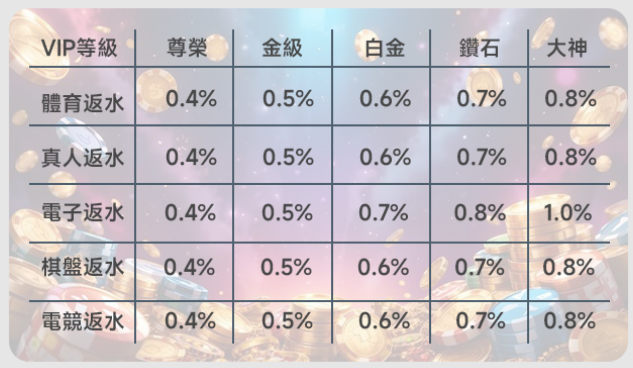 即時返水館別:全館返水,彩票類除外,採日退制,依會員階級退水%數計算,保留對活動的修改、停止及最終解釋權。