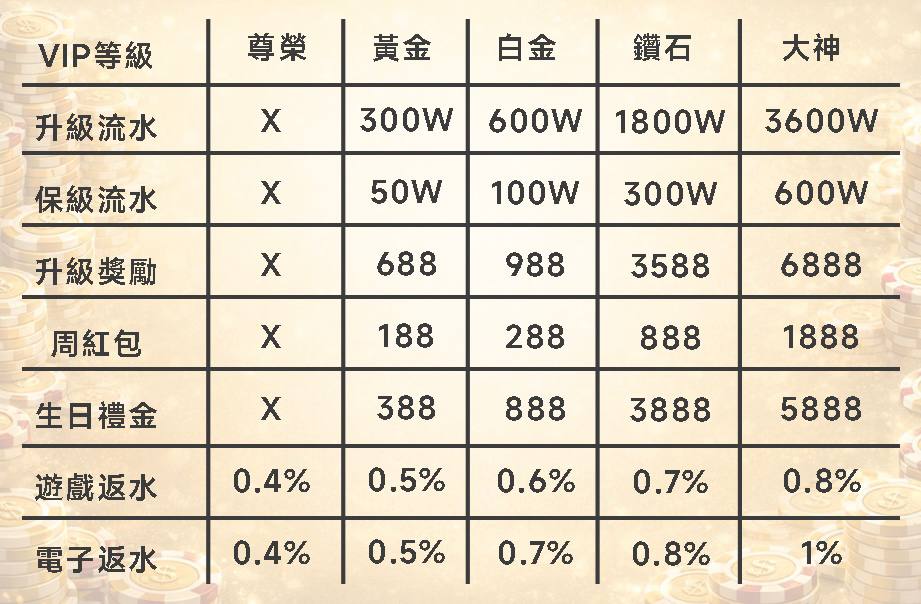 升級條件:會員累計投注量達到相應級別的要求後,將於次日中午12點自動升級相應VIP等級,升級每天僅能晉升一級!不可越級晉升。
